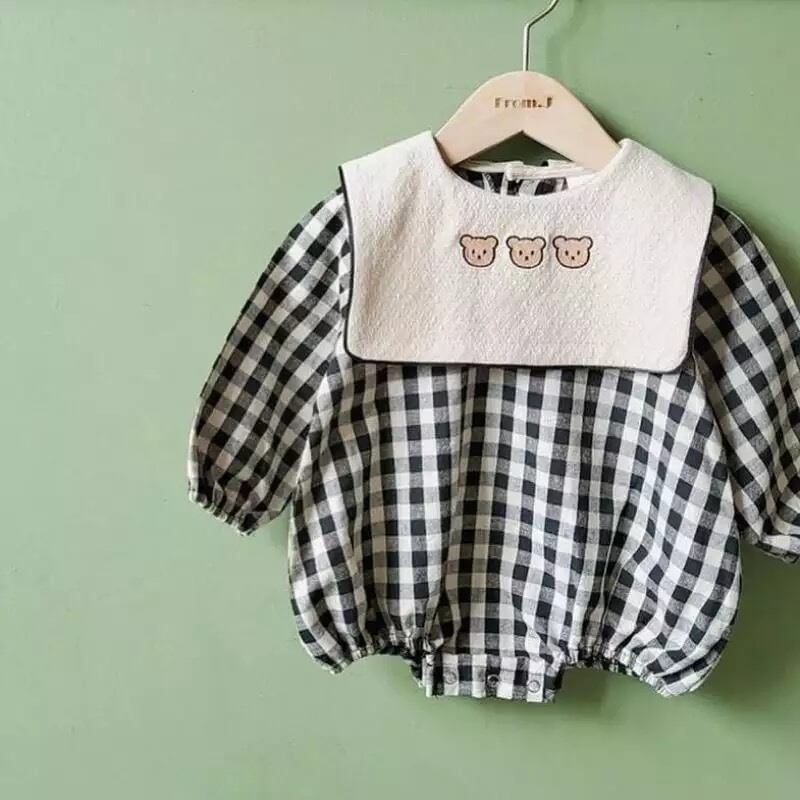 襟にくまさんチェックロンパース